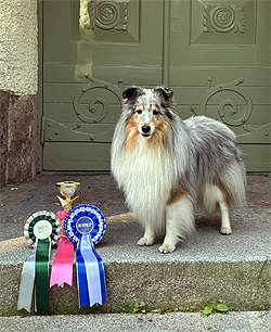 8-vuotias. Blue merle tan-värillä. Erinomaisessa kunnossa ikäisekseen. Erinomainen tyyppi. Oikeat pään mittasuhteet kuonon ja kallon välillä. Silmien väri vastaa turkkia. Puolipystyt korvat. Saksipurenta, mutta iän aiheuttamat vauriot. Oikea ylälinja. Oikean pituinen häntä. Syvä rintakehä. Etu- ja takaraajojen kulmaukset tasapainossa. Hyvä luusto. Oikea turkin väri ja rakenne. Vapaat liikkeet. Erittäin hyvin esitetty. Toivoisin täyteläisempiä tan-merkintöjä.